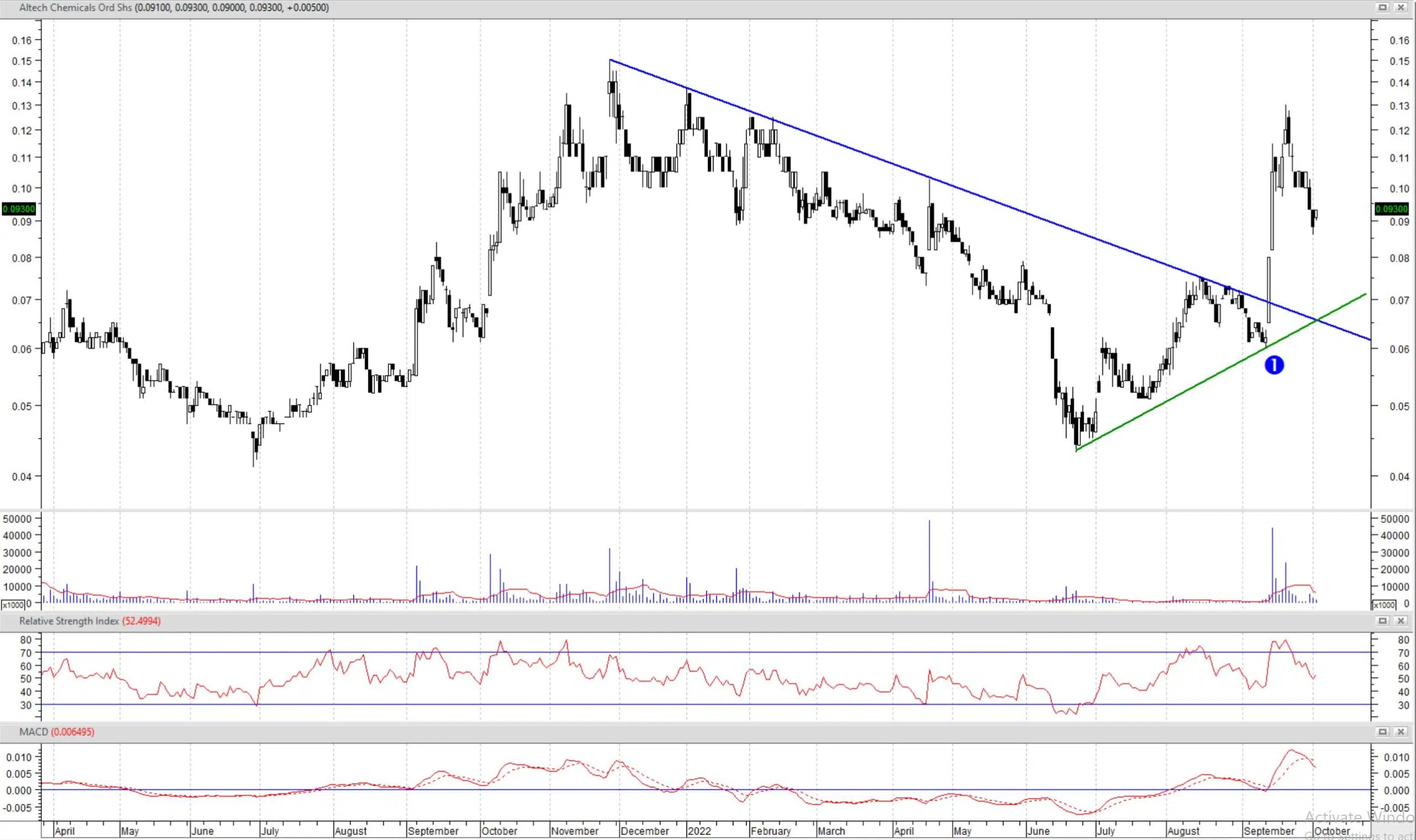 Altech’s share price broke the downtrend after its JV announcement and is now pulling back to the broken trendline, which should now act as support. It should then continue to rise alongside the short-term uptrend trendline (the green line on the chart).