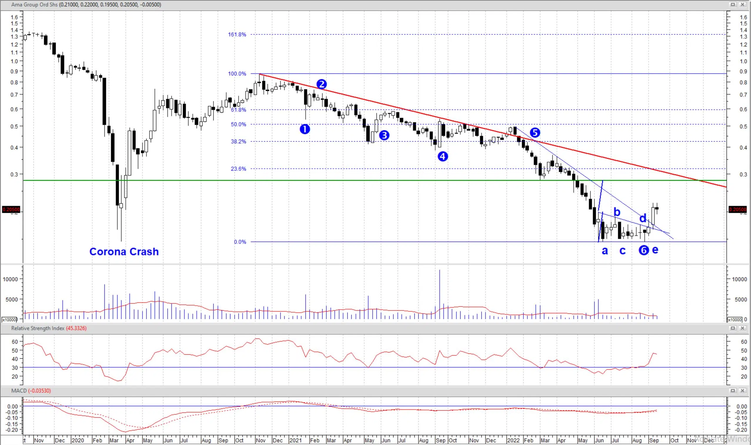 AMA’s share price consolidation in the last three months formed a reversal triangle pattern (shown by the “abcde” sub waves on the chart). The share price broke out of the pattern in the days following the release of FY22 results and the price action signals a shift in the sentiment to bullish with an initial target price of 28 cents for the triangle pattern (the green line on the chart).