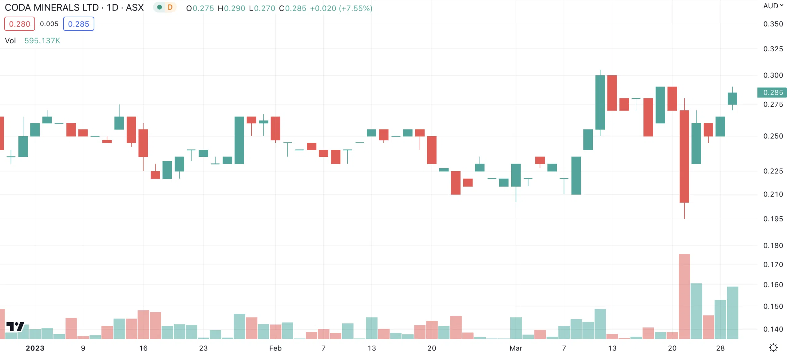 Coda Minerals (ASX:COD) share price chart, log scale (Source: TradingView)
