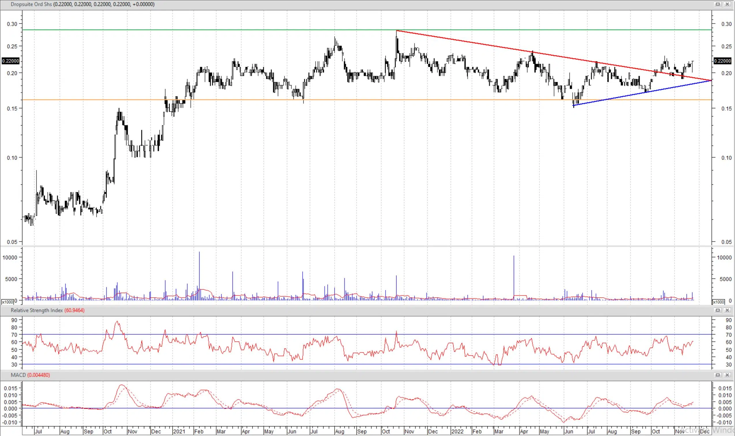 Dropsuite’s share price has broken the downtrend (the red trendline on the chart) and has confirmed the uptrend that started in June 2022 (the blue trendline) by making a higher high in October.