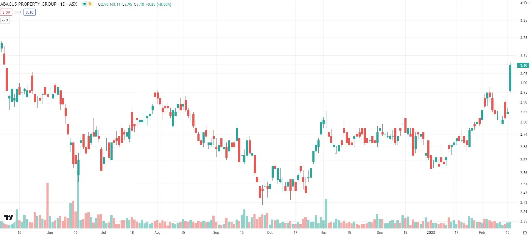 Abacus Property Group (ASX:ABP) share price chart, log scale (Source: TradingView)