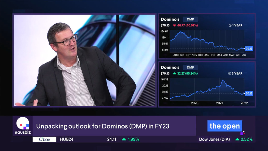 However, the standout stock of the bunch on his radar is Domino’s Pizza (ASX:DMP). He tells us the company’s less-than-ideal FY22 performance bodes well for a rebound in FY23 as consumers continue will continue to turn to the company for a cheaper food option in the face of rampant inflation. As Stuart points out, the price of a pizza from Domino’s Pizza hasn’t gone up all that much.