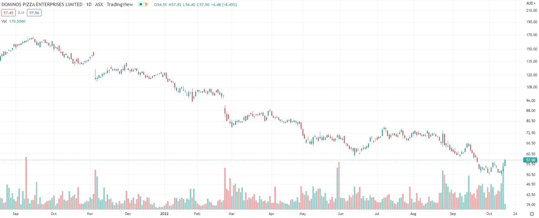 Dominos Pizza Enterprises (ASX:DMP) share price chart (Graph: TradingView)