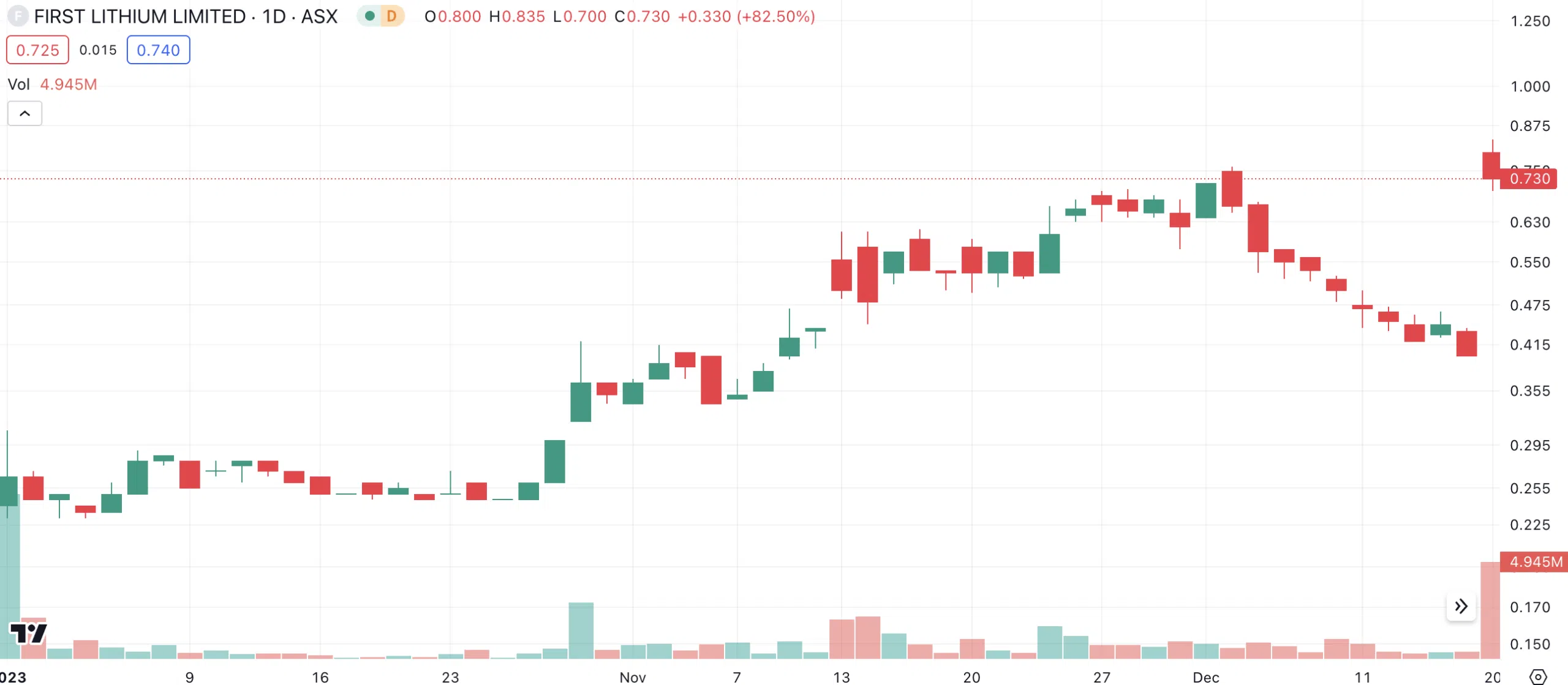 First Lithium (ASX:FL1) share price chart, log scale (Source: TradingView)